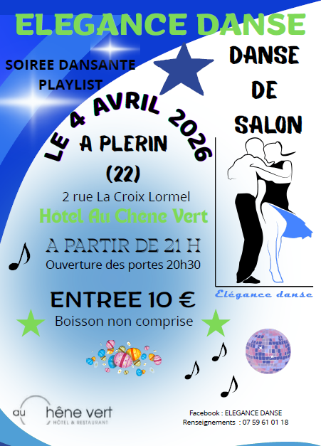 - Prochaine soirée dansante de Elégance Danse à Plérin: le 4 avril à Plérin. Toutes les informations sur l'affiche