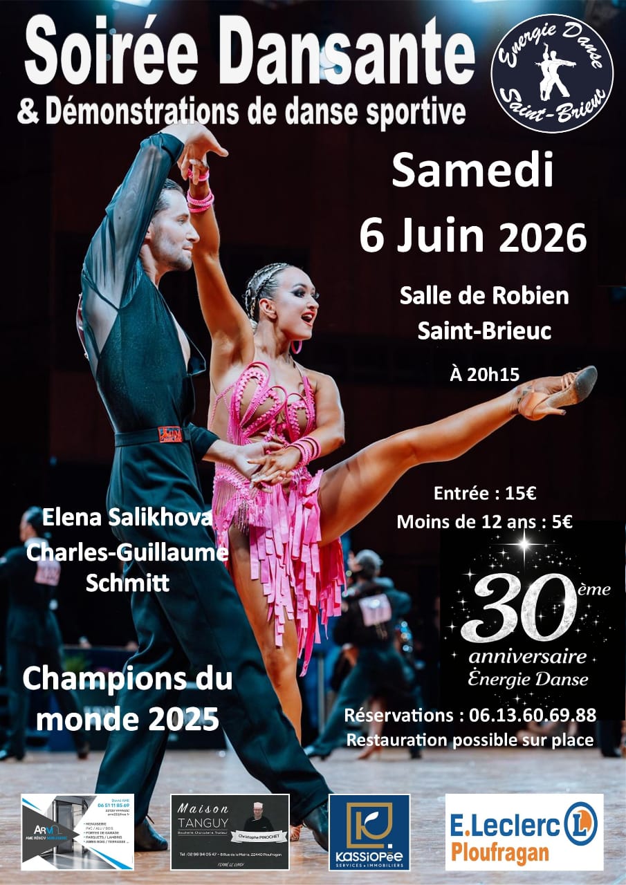 - Soirée dansante pour le 30ème anniversaire d'Energie Danse Saint-Brieuc le 6 juin 2026 à la Salle De Robien à 20h15. Tous les détails sur l'affiche.